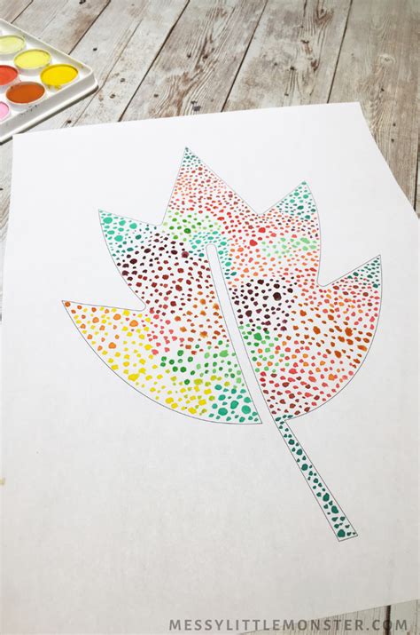 Pointillism leaf art for kids. Use watercolours, markers or even fingerprint! Before setting the kids off on their own, perform a quick demonstration for the class on a leaf of.